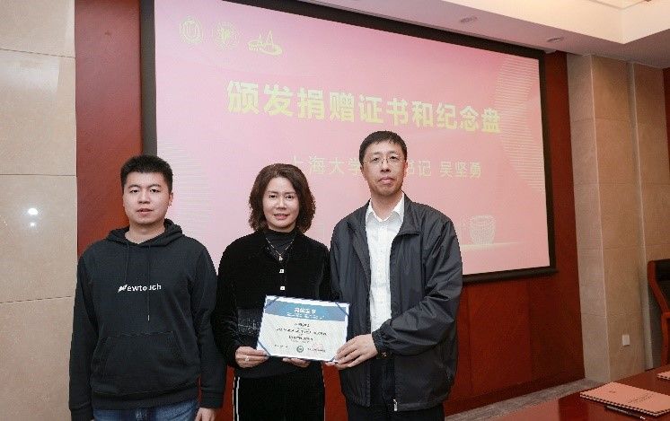 在与会嘉宾的共同见证下,太阳集团tyc539教育发展基金会秘书长陈然与徐海珍校友代表双方签署捐赠协议。校党委书记吴坚勇向徐海珍女士颁发捐赠证书和纪念盘。