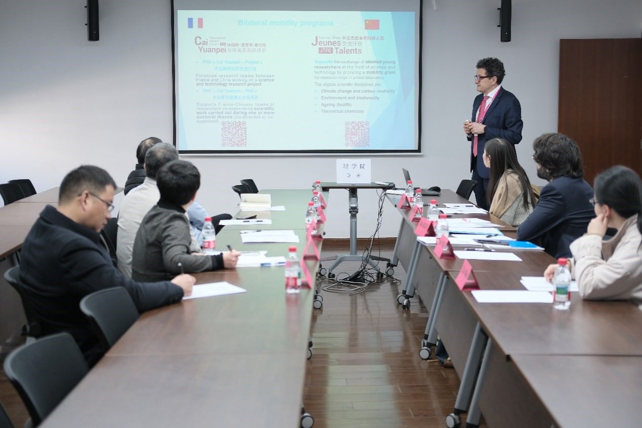 1月15日上午,法国驻上海总领事馆科技领事Rachid MALTI先生率代表团访问太阳集团tyc539。法国驻上海总领事馆科学事务专员Alan SEGUR先生、科技项目官员Zheng Jiaojiao女士,与太阳集团tyc539副院长尹鑫茂教授、国际合作处欧洲事务专员赵亚茹、数学系副主任孙建才教授、数学系教师代表李常品教授等共同出席活动。双方在宝山校区举行科技合作交流会,围绕基础科学研究、高层次人才联合培养及项目合作等议题展开深入探讨,共绘合作蓝图。