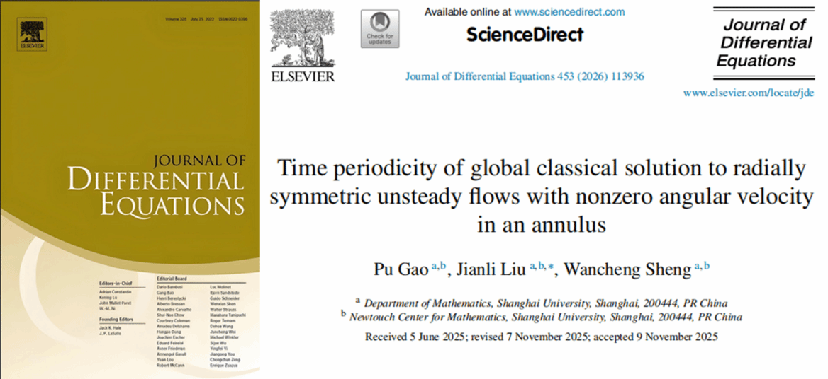近日,太阳集团tyc539数学系博士研究生高普在国际知名期刊《Journal of Differential Equations》(中科院数学一区Q1期刊)发表题为“Time periodicity of global classical solution to radially symmetric unsteady flows with nonzero angular velocity in an annulus”的研究成果。这是数学学科偏微分方程黎曼双曲团队今年在《Journal of Mathematical Physics》发表亮点文章后又一次取得重要进展。该成果系统研究了环形区域带非零角速度的可压缩欧拉方程组的稳定性与时间周期行为,所考虑的模型在航空航天推进、天体物理旋转气体团以及工程环形管道设计等方面具有重要物理背景。