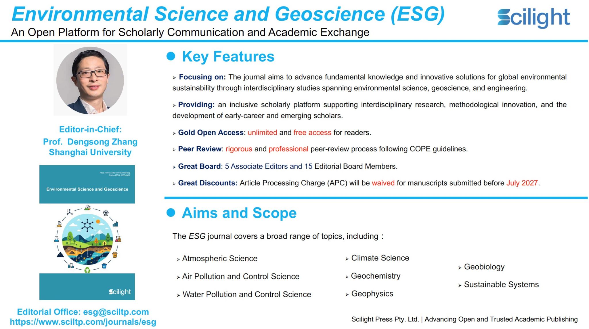 Environmental Science and Geoscience (ESG) 期刊致力于环境科学、地球科学及相关工程领域的跨学科研究,旨在深化对全球环境可持续系统的科学认知并推动其创新性发展。期刊涵盖广泛的研究方向,主要包括:大气科学、空气污染与控制、水污染与控制、气候科学、地球化学、地球物理学、地球生物学以及可持续系统。