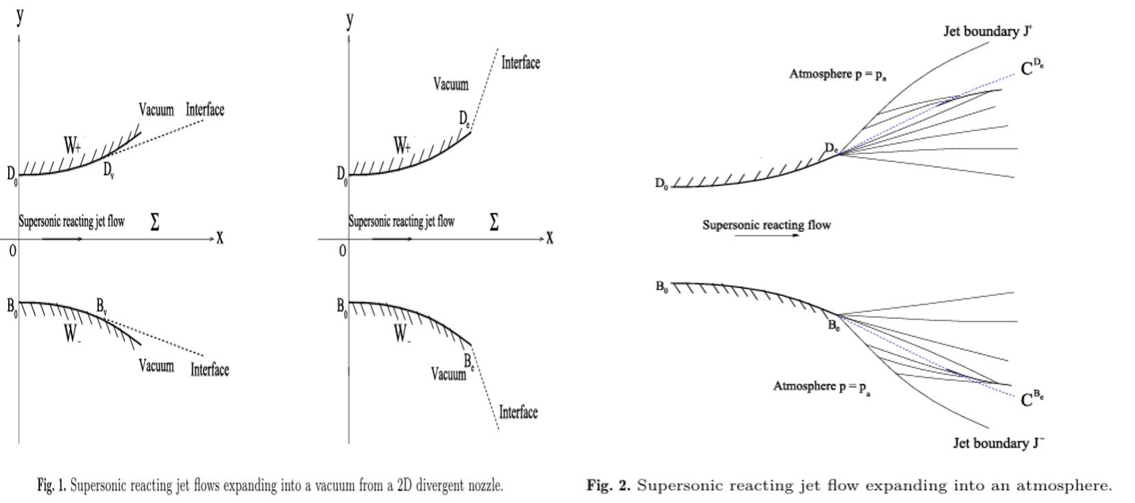 该成果是本团队继2013年在航空航天和国防领域冲压式喷气发动机三维锥形喷管的燃气超声速射流方面(SIAM Journal on Mathematical Analysis,2023)后的又一重要成果。冲压式喷气发动机通常采用de Lavel喷管,其射流喷出的速度达到超音速甚至高超音速,被广泛应用于现代飞行器,导弹和火箭等领域。本研究成果从数学上严格证明了当喷嘴周围是真空或静态大气且其压力低于射流在出口处的压力时,喷管射流的整体解以及射流中冲击波的形成机制。这一结果为Courant和Friedrichs在上世纪四十年代研究超音速流描述出现冲击波物理现象提供了严谨的数学证实。
