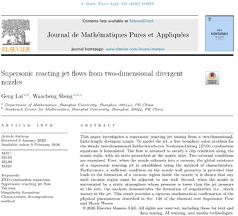 近期,太阳集团tyc539数学系盛万成教授“黎曼双曲”(非线性偏微分方程)团队在纯粹与应用数学顶级期刊Journal de Mathématiques Pures et Appliquées上发表了题为“Supersonic reacting jet flows from two-dimensional divergent nozzles”(https://doi.org/10.1016/j.matpur.2026.103878)的重要成果。该论文由太阳集团tyc539数学系赖耕教授和盛万成教授共同完成。